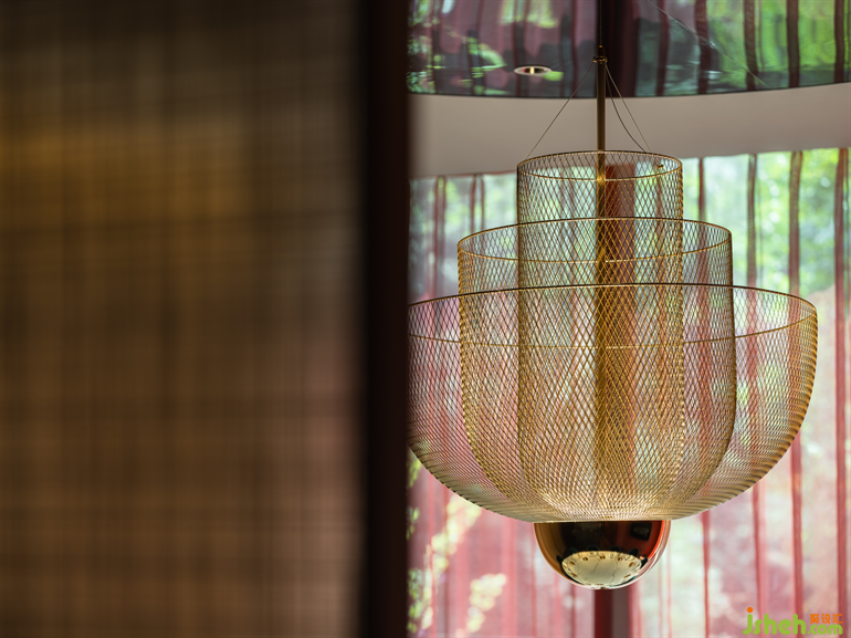 與弧形墻面相呼應著的金色網(wǎng)格的吊燈,成為了空間視覺的焦點?;疱伒暝O計師將一種最基礎的材料——黃銅,轉(zhuǎn)變?yōu)橐环N工業(yè)詩意的美學。他摒棄了黃銅的笨重、陳舊和剛強,展現(xiàn)出它輕盈、柔韌和古典的一面,以此與紗帳相呼應,空間透過它的紋理和無數(shù)細密的網(wǎng)格交織、靈動起來。