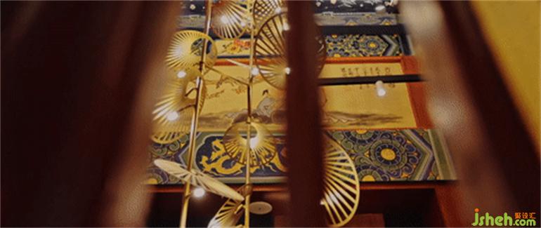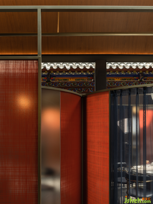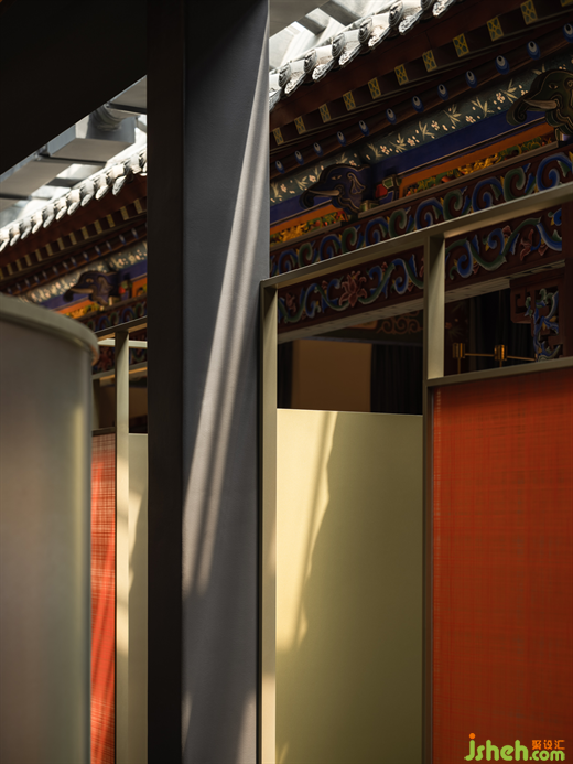 紅色的布藝、黃銅框架與屋檐下富麗的金紅紋裝飾相呼應(yīng)?;疱伒暝O(shè)計(jì)淺藍(lán)、深藍(lán)、藤黃、朱紅、翠綠、堆白交織混雜在一起,仿佛一抬起頭,便聽得火樹星橋、燈火闌珊;一低下頭,又被理性的幾何線條所中和。這個(gè)空間中交融了兩種截然不同的美學(xué)風(fēng)格。