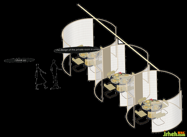 火鍋店設(shè)計(jì)不同的10人包間相互呼應(yīng),枝形吊燈使視線聚焦,一層層水平堆疊的線盤螺旋朝上或朝下展開,最后匯聚在一根金屬筒燈之上。