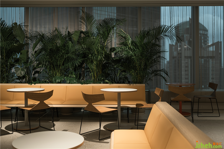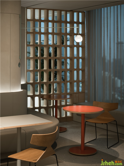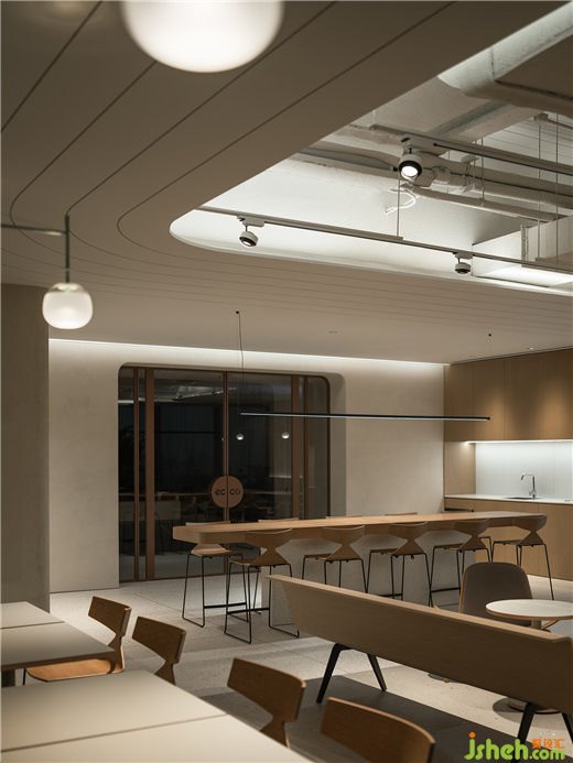 長木桌散發(fā)著冷靜和沉著的氛圍,珊瑚橙色圓桌毫不費(fèi)力地突顯了區(qū)域,同時(shí)不顯得過于大膽。附近的落地窗采集自然光,為設(shè)計(jì)注入了獨(dú)創(chuàng)性,總部辦公室裝修設(shè)計(jì)營造了一個(gè)舒適和諧的環(huán)境。