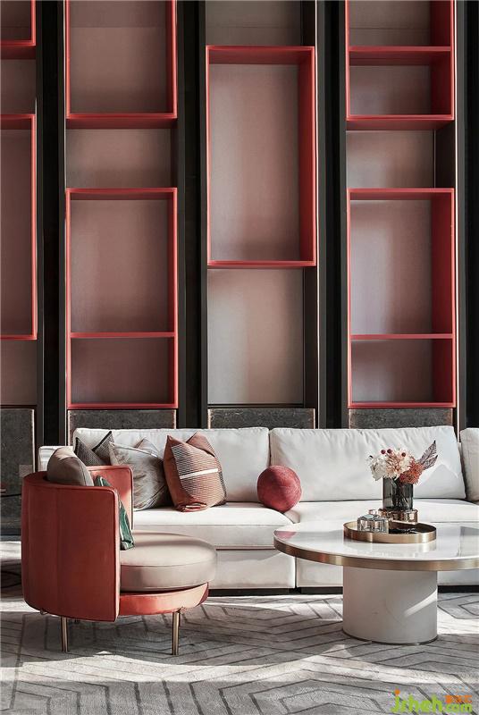 洽談區(qū)幾組自然質(zhì)樸的家具,營銷中心設(shè)計(jì)在顏色上選取嶺南風(fēng)韻的代表色——紅色進(jìn)行鋪陳,綠色抱枕點(diǎn)綴其間,透過紅色格柵的背景墻隱約現(xiàn)出一幅朱紅藝術(shù)畫,點(diǎn)睛之筆引起空間共鳴。