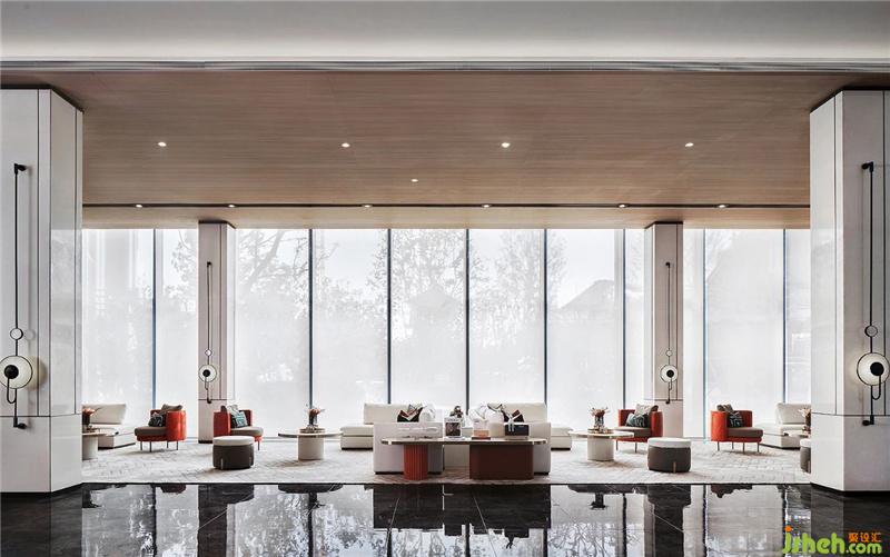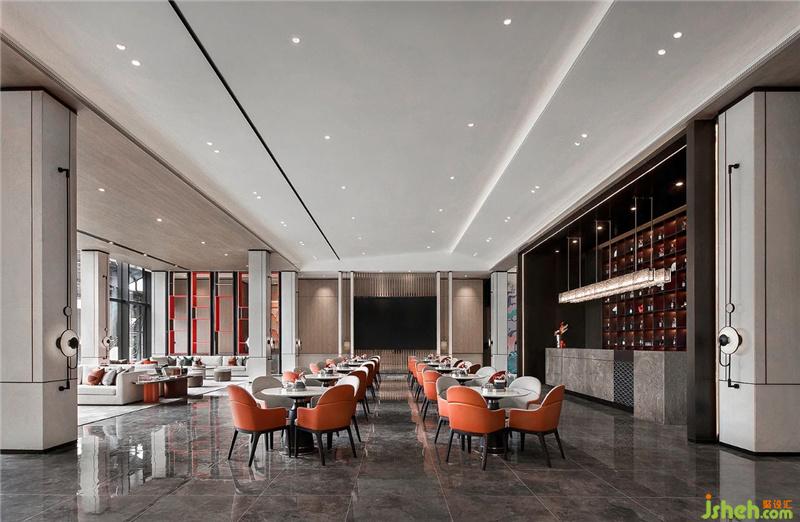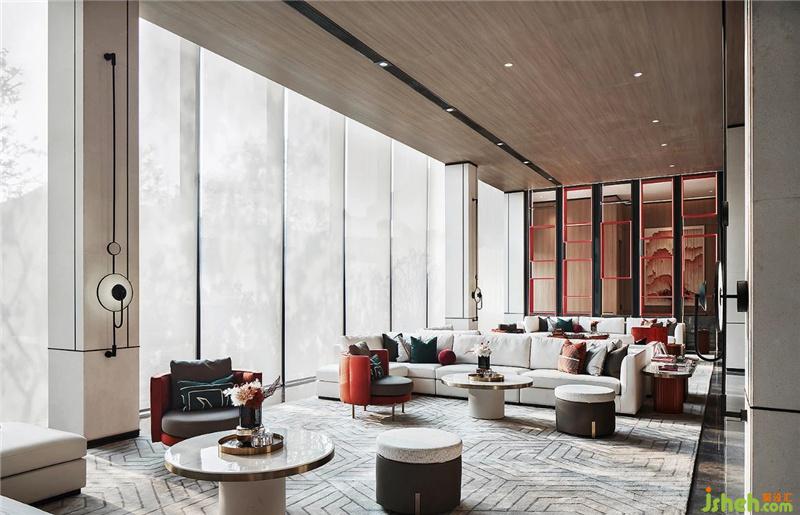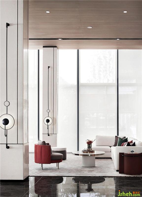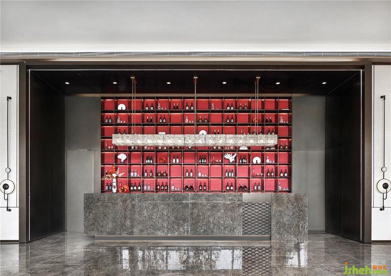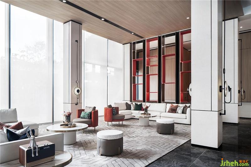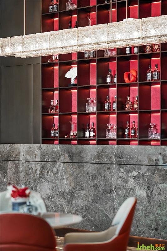 水吧臺背景墻以紅色呼應(yīng)空間顏色,建筑瓦礫細(xì)節(jié)藏于吧臺間。營銷中心設(shè)計(jì)將水元素、魚燈和建筑特色伏線于細(xì)節(jié)中,節(jié)奏干凈到位,層層遞進(jìn),用空間來設(shè)計(jì)、引導(dǎo)風(fēng)雅生活的當(dāng)代回歸。