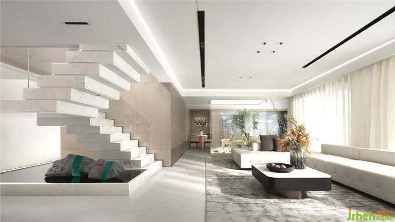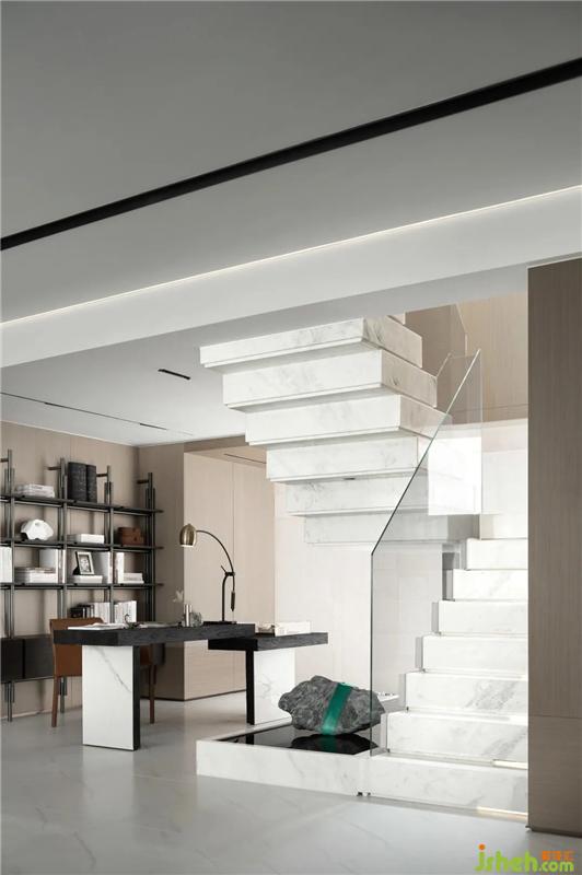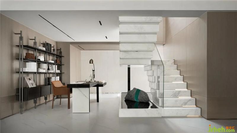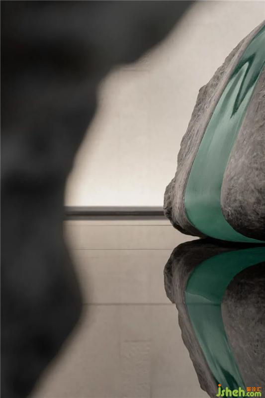 樓梯間內(nèi),水之光倒映佳影,樹之光映襯水的曼妙之姿,石之光點亮水面,綠寶石一般的原石呈現(xiàn)在富有韻律和想象的空間中轉換游走,令人感動于生活的品質(zhì)與驚喜深圳樣板間設計。