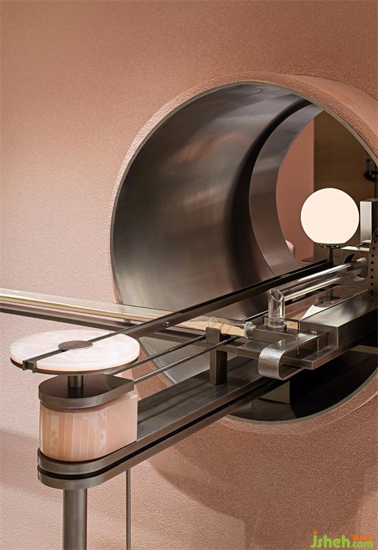 在不破壞整體造型的情況下,設(shè)計(jì)師將烘焙產(chǎn)品的明檔展示、陳列納入對(duì)設(shè)計(jì)的考量之中,把其他區(qū)域以“鑲嵌”的形式植入,以此轉(zhuǎn)換最大化的空間運(yùn)用,串聯(lián)起了不同區(qū)塊的空間趣味性。