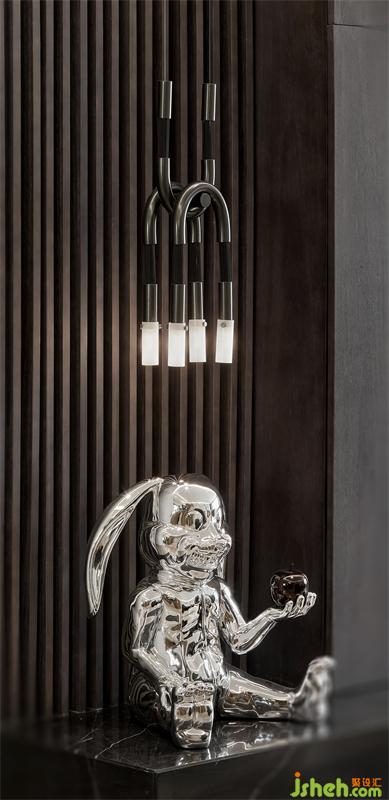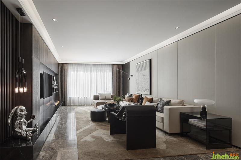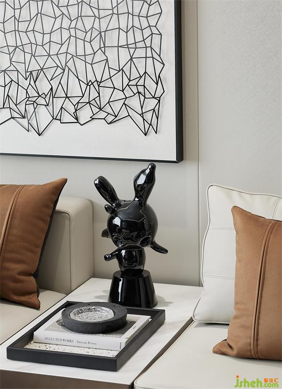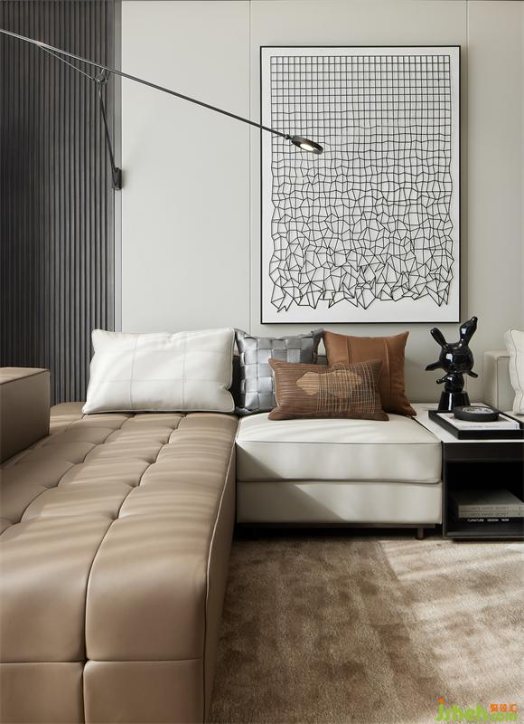 透過窗戶灑下的光影渲染獨(dú)具特色的空間韻律,半包圍的沙發(fā)Lawrence “Clan”元素采用現(xiàn)代圖形拼接設(shè)計(jì),賦予構(gòu)圖更具動(dòng)感的韻律,并為客廳裝飾營造沉穩(wěn)而不失奢華的低奢交談空間,摩登端雅兼具美學(xué)內(nèi)涵。
