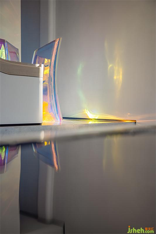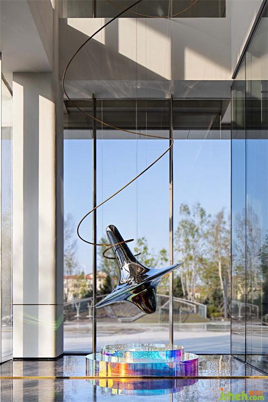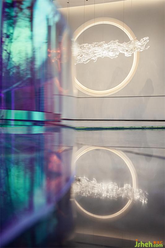 Visually, the extension of lines interweave with the gyro artwork surrounding the mirror, and the refraction of the light blurs the boundary between solid and liquid, just like the dazzling flow of light reflecting on the ground at dawn.