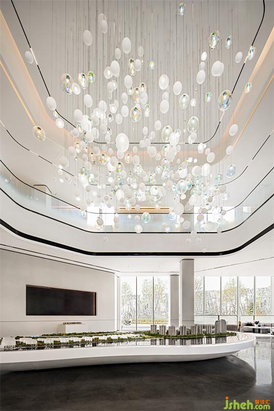 營銷中心設(shè)計延續(xù)空間漫射的光線,仿如雪花般晶瑩的鉑金吊飾,動態(tài)的景觀形態(tài),在這神秘的氛圍中緩緩踱入,感受設(shè)計賦予空間的地域特色。