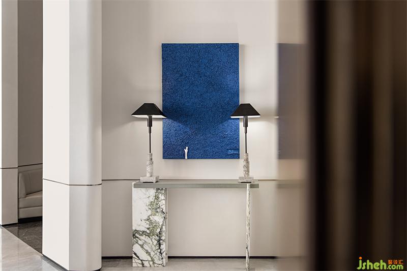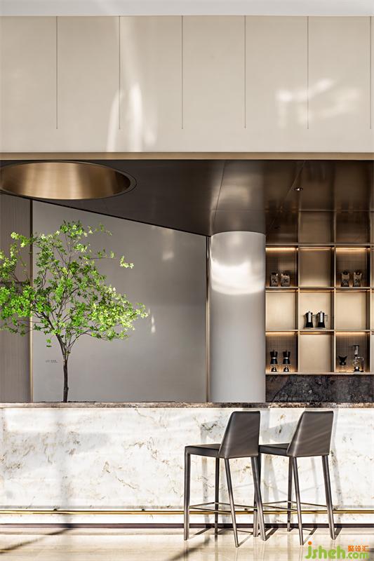 金屬的冷冽與華貴,通過現(xiàn)代裝飾語言的轉(zhuǎn)化,回應(yīng)了空間應(yīng)有的厚度與質(zhì)感,與一旁的玻璃幕墻對望映襯,一面清緩、一面醇厚,顯露出和諧的自在狀態(tài)。
