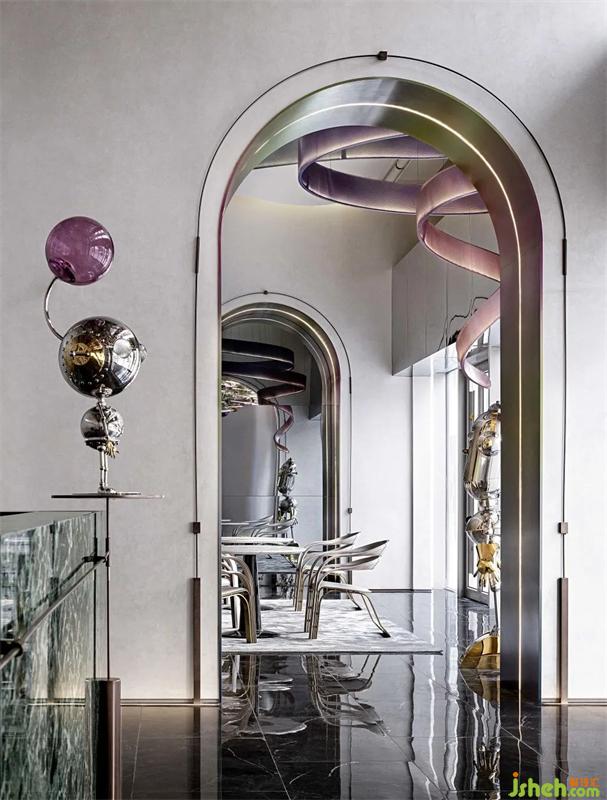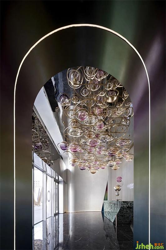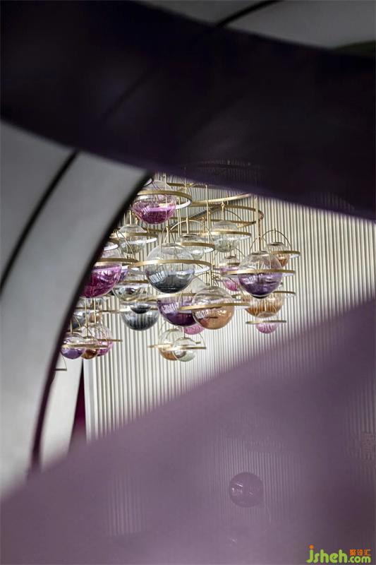 一方面在美學基礎(chǔ)上進行體驗對象的再塑造,另一方面以璀璨宇宙星辰的提煉,變幻而又純粹,延伸到空間設(shè)計中的吊飾的視覺語言??臻g中融入氛圍的藝術(shù)裝置是設(shè)計中加法的呈現(xiàn),來自未來科技的金屬機器人將朦朧奇幻的空間置入現(xiàn)實,賦予空間靈動的活力,讓空間的趣味性和探索性恰到好處。