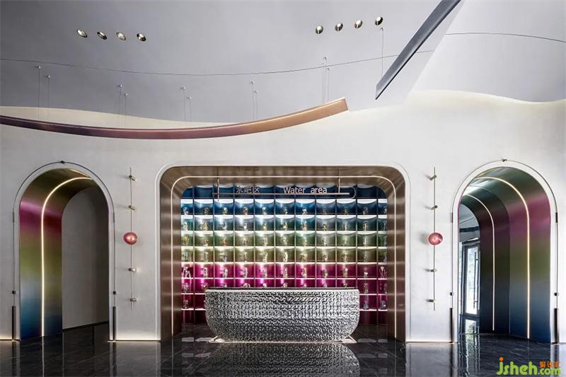 入門接待區(qū),以幻彩的行星天花形成極具科幻般的視覺沖擊,售樓處設(shè)計為接待前廳預演一場新鮮又未來的步入式體驗。