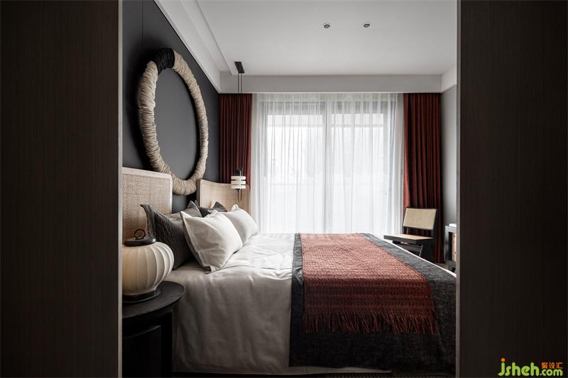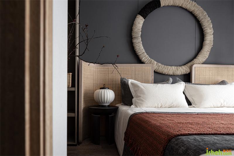 穿過樓梯,來到二樓,臥室的設(shè)計以高級、柔軟為基調(diào),大體量的藤質(zhì)用材,樣板房設(shè)計以其本真之態(tài),泛起淡淡的恬靜與溫存,給予臥室空間富有質(zhì)感的底色。暗紅窗簾點綴了空間的色彩生機,讓質(zhì)樸的灰色俏皮靈動了起來,在提升空間隔光效果的同時,又營造出了沉穩(wěn)之感。