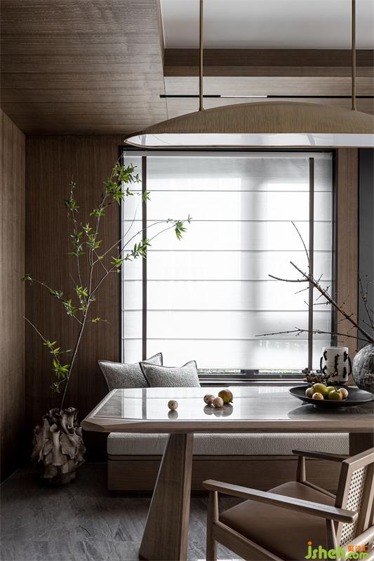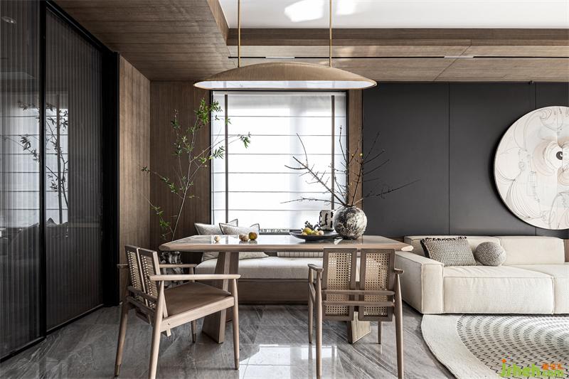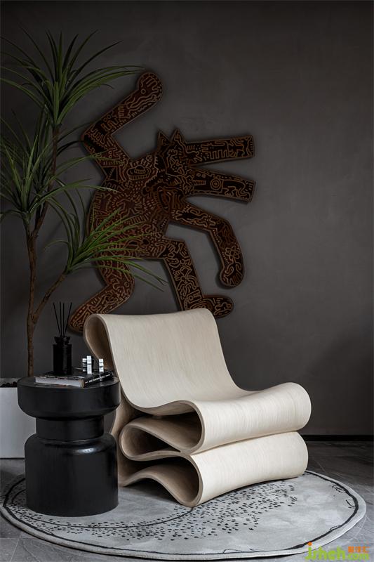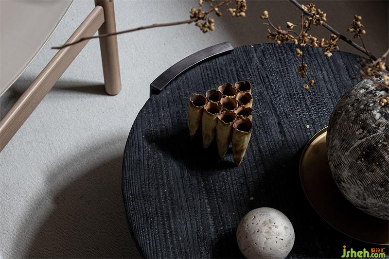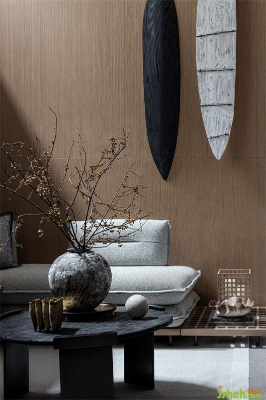 原石打磨穿制的藝術(shù)品掛件,與墻面的留白壁面相得映彰,樣板房設(shè)計黑色、白色、胡桃木色傳遞出溫暖的質(zhì)感,有一瞬間總會憶起過往漫漫的歲月長河。