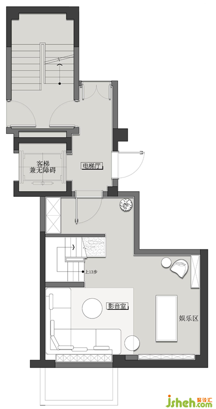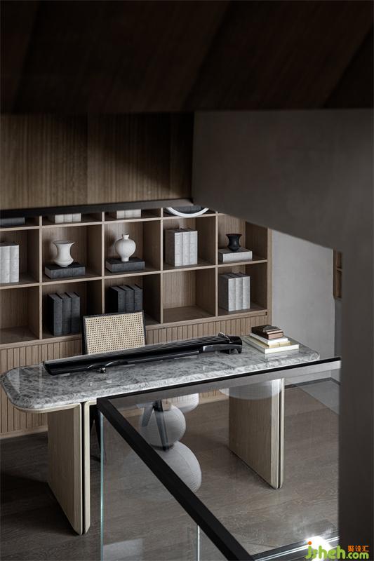 夾層作為閑適空間的延續(xù),樣板房設計設置半放式書房于此,可開可合,相對獨立又相對開放,輔以白梅的傲立姿態(tài),空間開闊有致,尺度豐盈,給居住者足夠的思考探尋與秩序生活。
