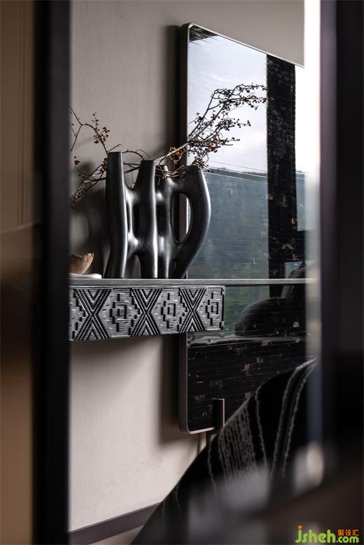 考慮到男主人品鑒和收藏的需求,設計師弱化了餐廳的邊界,樣板房設計增加了可供收藏、收納的餐邊柜,轉(zhuǎn)換為休閑家庭迷你吧。