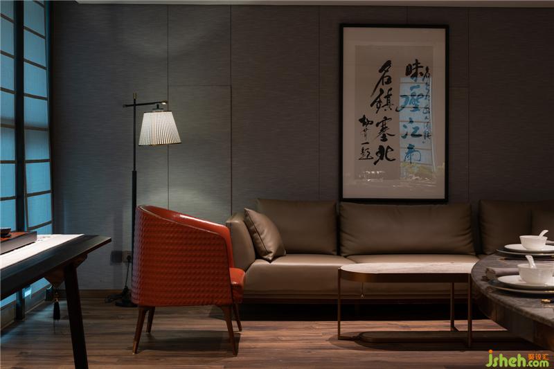 紅皮沙發(fā)的點(diǎn)綴給沉寂的空間增加一抹亮色,塑造空間高級(jí)感,似江南后院滿屏翠綠中望見的石榴,如行至煙水巷內(nèi)偶遇的紅傘。
