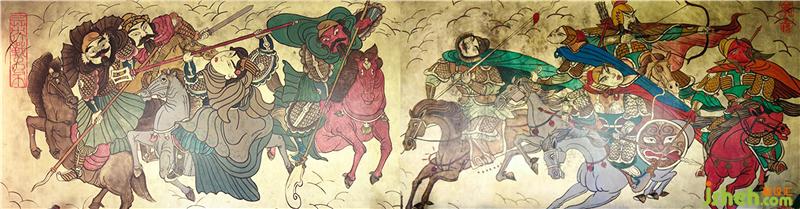 大廳內(nèi)的壁畫(huà)是整個(gè)場(chǎng)所色調(diào)的靈感之眼,點(diǎn)睛之筆。藝術(shù)家將傳統(tǒng)的三國(guó)故事中兩大高潮——三英戰(zhàn)呂布和五虎上將重新繪制,既保留民俗畫(huà)的質(zhì)樸率真,又體現(xiàn)國(guó)士之風(fēng)兄弟情義以延續(xù)空間情感。設(shè)計(jì)師則從中提取五行設(shè)色,將這些情感色彩語(yǔ)言應(yīng)用到空間里。室內(nèi)每一張餐桌擺放著代表新榮記標(biāo)志的琉璃麒麟擺件,為餐廳增添了幾分趣味。