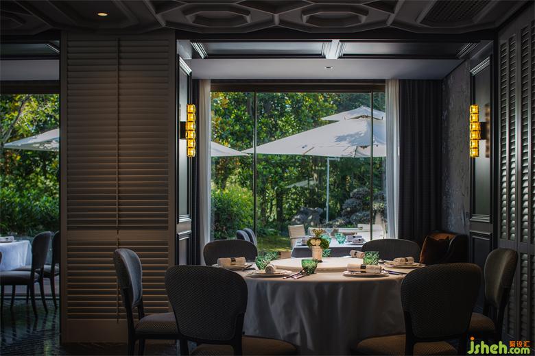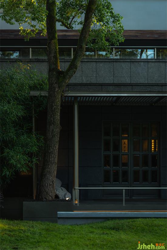 散廳外,越過(guò)曲折汀步,賓客坐于庭院池邊,餐廳設(shè)計(jì)臨行小憩,清水敲擊磐石,靜待天色微暗,夜幕漸起。