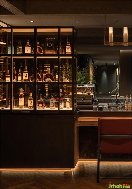 暖光渲染柜中美酒,陣列式燭臺懸掛操作臺上方,視線穿透咖啡吧望見遠處長廊,隨步調(diào)轉(zhuǎn)折,飲茶空間被徐徐展開。