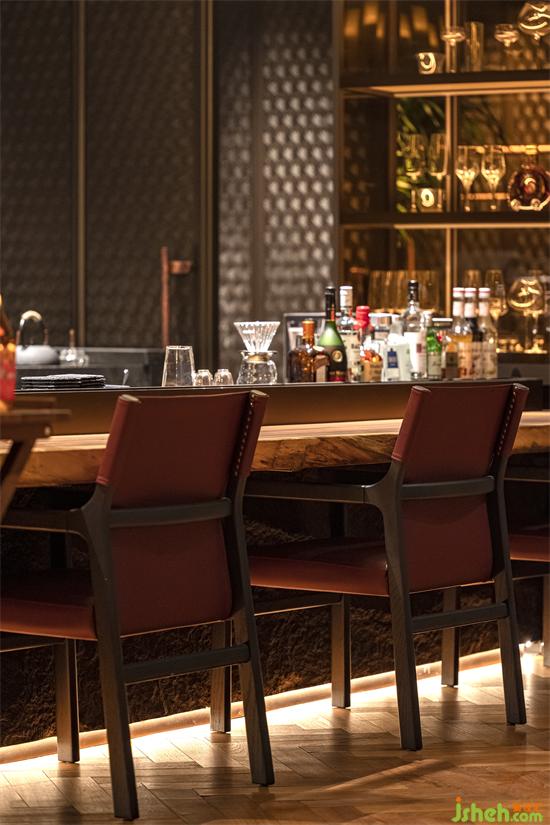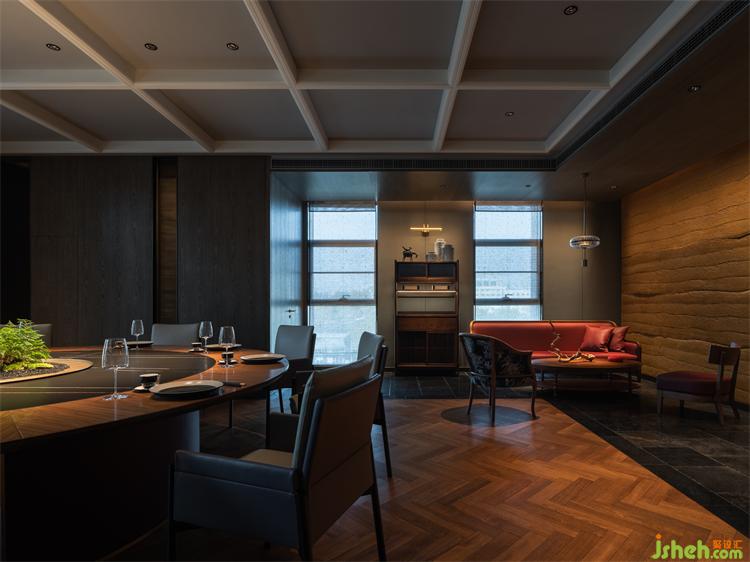 灰色調(diào)的空間中,低奢黑色巖板與暖色桃木色相拼合,朱紅皮革面料活躍于場所中,材料的變化融合新舊元素,傳達(dá)著空間情緒。