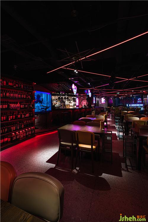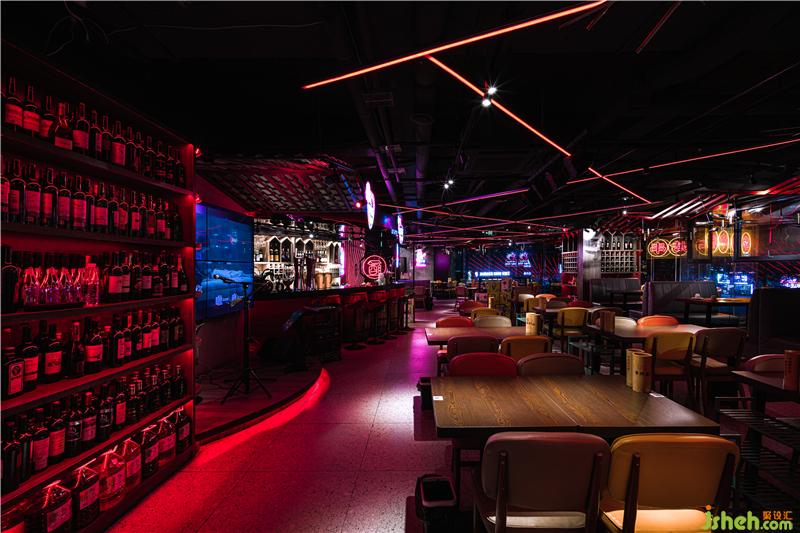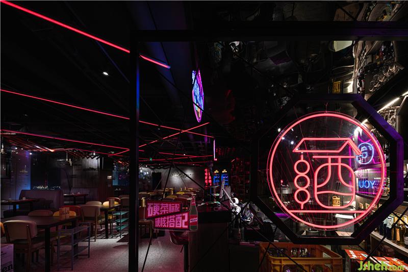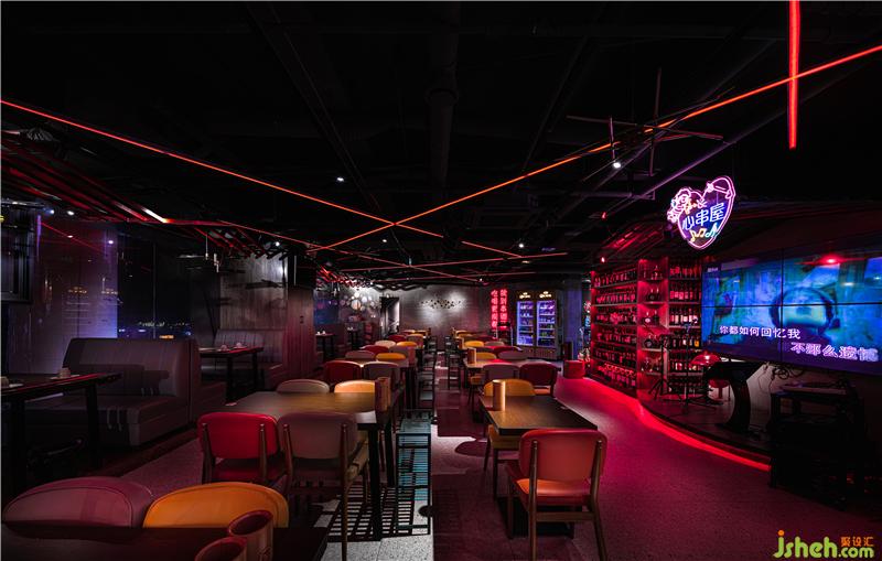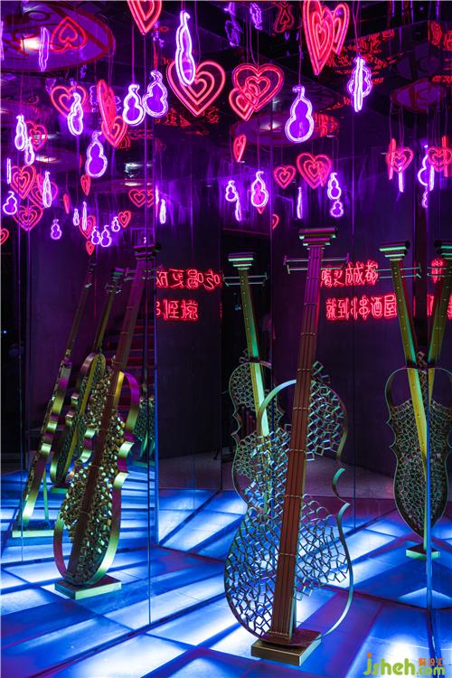 進(jìn)入大廳,空間感上強(qiáng)烈的折線造型以串串的造型為靈感,在有限的空間里,折線造型的紅色的燈光照射著四面八方,讓成都紅紅火火的景象感染著食客們。不同的折線造型代表著不同的串串形態(tài),南京餐廳設(shè)計食客們被這些與眾不同的造型所吸引,有種恍如隔世的地域特色,帶著濃濃的巴蜀風(fēng)味。一把把大提琴的雕塑仿佛在奏著樂,音符充斥著整個大廳。其背景是五光十色的背景板。愛心和音符的掛件擺放在天花板上,燈光和軟裝部分加重了力度,讓彩色的光線成為第一設(shè)計元素,這樣做既能減少投入,也能營造出讓人印象深刻的感覺。