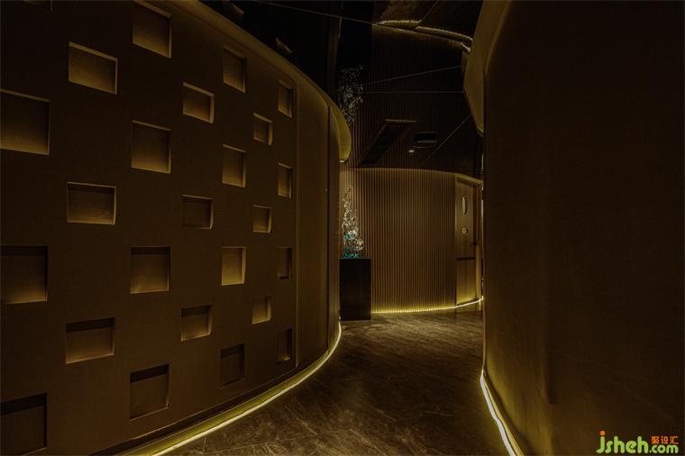 我們在空間中打造出只能看見“光”,卻看不見“燈”的效果。所以不僅僅是燈光設(shè)計(jì),也是明暗的設(shè)計(jì),走在過道上,仿佛置于一個被海水包圍的輕松感,讓禪意之美與情韻在視線延伸中娓娓道來,步移景異。