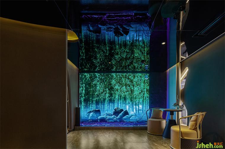 燈光是空間藝術(shù)氛圍的調(diào)節(jié)師。在整個室內(nèi)的主體色為昏暗的大地色環(huán)境中盡顯純粹而沉靜。特別是燈光的投射與不同位置的藝術(shù)裝置鋪陳相結(jié)合的關(guān)系,比如與頂部的鏡面相遇,養(yǎng)生會所設(shè)計(jì)讓整個空間脫離了沉悶,令空間無限延展,孕育出別樣的可能;利用邊角過渡空間塑造的置景,巧而精致:電子屏竹墻、地面的大理石、意境雕刻的水滴與質(zhì)感的海浪……無一不是刻意而為,卻呈現(xiàn)著自然和諧之美。