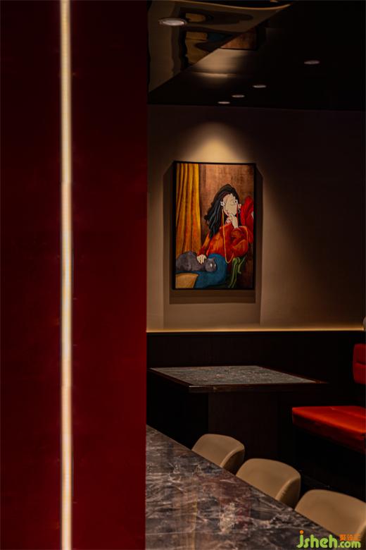 卡座的設(shè)置,悄然間打破空間炙熱與升騰的氛圍,在空間色彩中尋找新的平衡美感。就像火焰的余溫一樣,雖然強烈的愛讓生活熾熱,但余生的歲歲年年卻是一日三餐的溫暖。