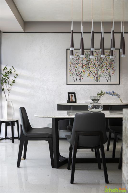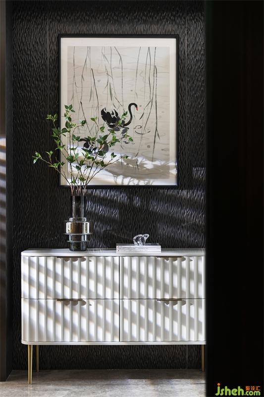 進(jìn)入玄關(guān),我們采用了東方水墨色留白的反差視覺體驗(yàn),畫中的天鵝在水中高雅的情調(diào),柳條輕盈的垂落下來,與臺(tái)面的花藝虛實(shí)結(jié)合融洽和諧,材質(zhì)特性讓室內(nèi)陽光灑入,溫暖流淌。