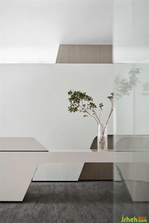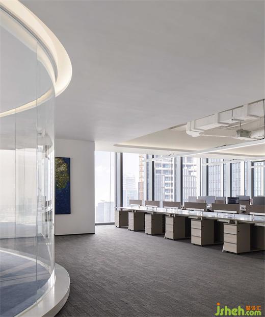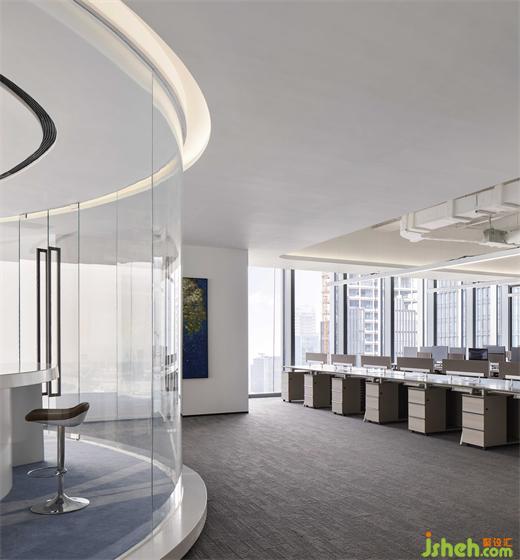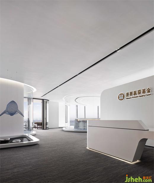 圓的遞進(jìn)、分布,在不遠(yuǎn)處牽引人們的視線。垂直嵌入的兩個圓形裝置,如鯨魚吐出的水泡,善擇基金辦公設(shè)計(jì)以晶瑩剔透的弧面玻璃為隔斷,保留開闊空間的輕盈感,又豐富了層次,賦予空間想象力。