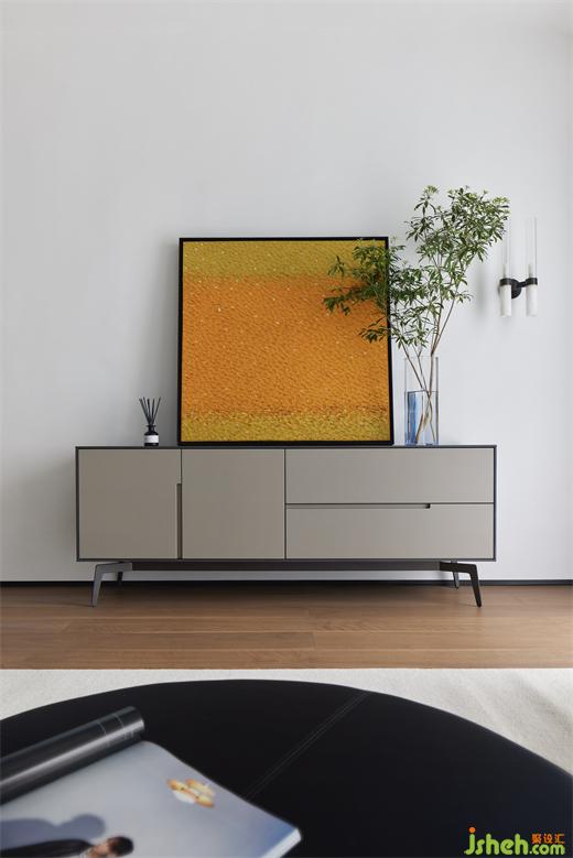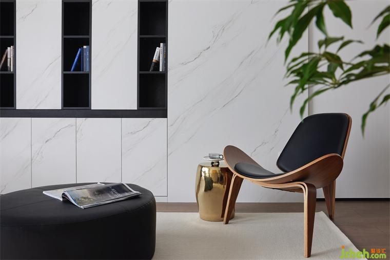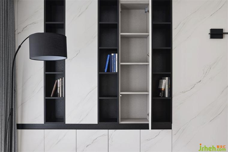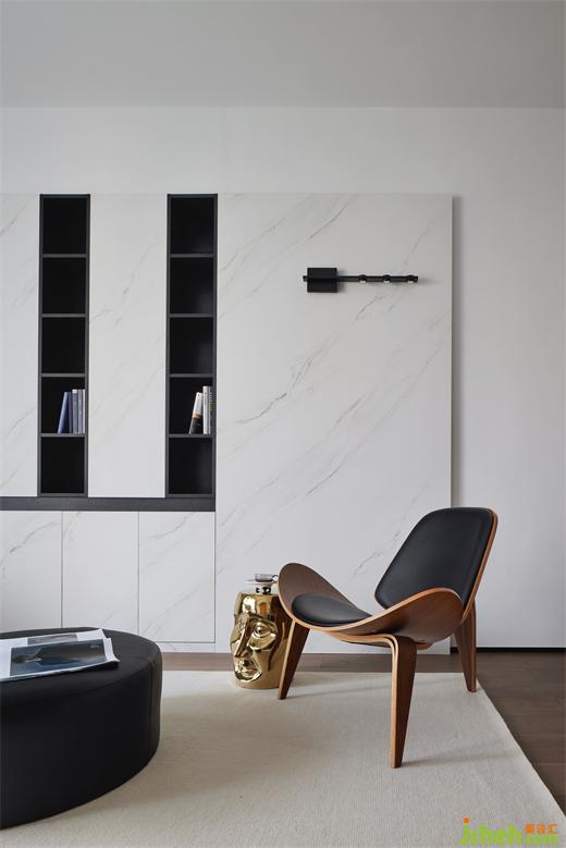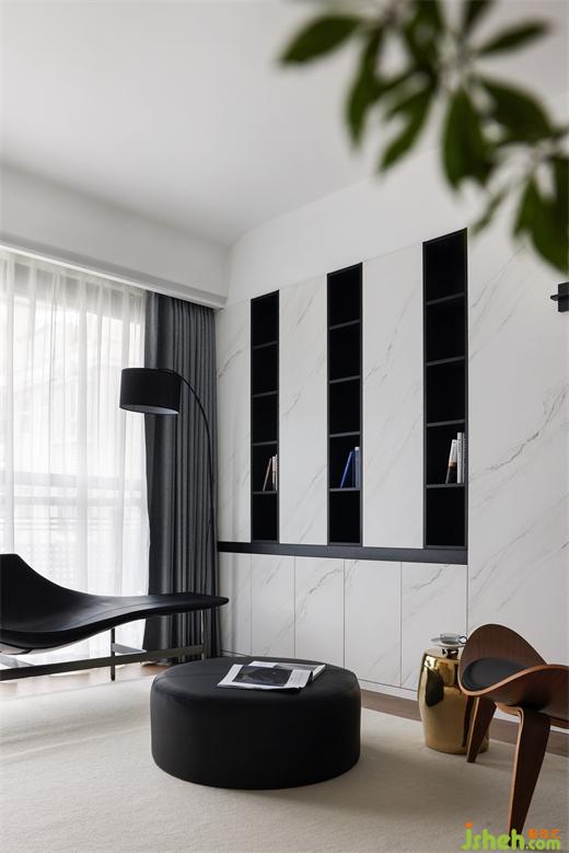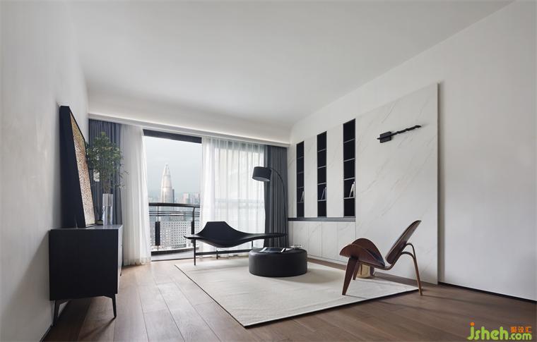 從玄關(guān)處即能看見(jiàn)客廳,因?yàn)槠綍r(shí)不看電視,裝修公司所以把客廳做成了休閑、娛樂(lè)和閱讀區(qū),靠一面墻體做了大面積書(shū)柜,部分開(kāi)放出來(lái)做展示。從客廳看出去,是深圳灣最美的城市景觀,給一家人營(yíng)造一個(gè)舒適的看書(shū)、玩耍、聽(tīng)音樂(lè)的家庭陪伴空間。