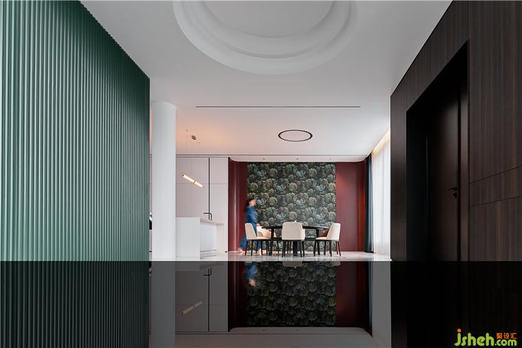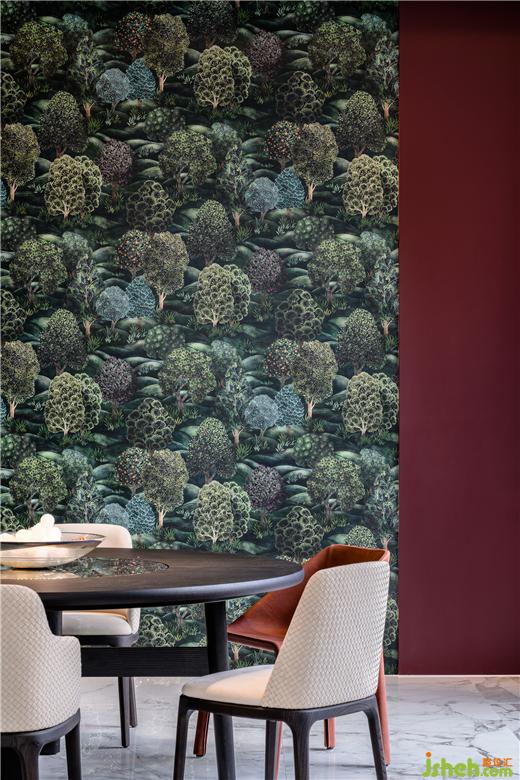 在居室空間中,墨綠色幕墻位于中心,形成視覺焦點。別墅裝修設(shè)計圍繞這堵墻四周分別是客廳、餐廳、廚、樓梯間、健身房,以及方便老人上下樓的電梯間。餐廳處的壁紙來自Cole&Son,畫面選用樹木及灌木叢主題,營造出被包圍的感覺。
