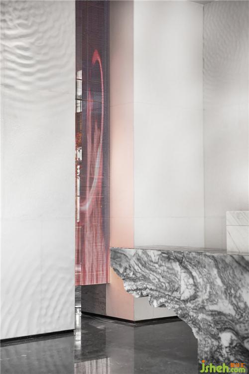 水是榕城的重要城市肌里,多條水系繞城而過涌入大海滋潤世代人民。我們以創(chuàng)意石材雕刻水波紋,于接待前廳的L型墻面環(huán)抱相擁,倒映于光亮的大理石地面連成一片,虛實相接意境頓生。特色大理石藝術(shù)化及類石雕的手法處理與拼裝后的接待臺,一邊是莊重、一端是當(dāng)?shù)厮囆g(shù),水與石的關(guān)系在這里相融相生。