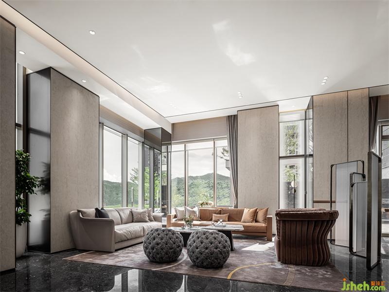 在這個(gè)停留時(shí)間最長的區(qū)域,營銷中心設(shè)計(jì)運(yùn)用了平滑與粗糙肌理的材料對比,米白啞光天花與原木條天然紋路天花、多層次的墻面造型穿插以簡潔石材、磨砂鏡及拉絲古銅鋼材等等的立體構(gòu)成,以這樣的穿插與對比,有節(jié)奏地融合在一起形成有張力但不會(huì)生硬的空間格局,加上壓于全場地面的奧地利灰亂流紋路大理石,烘托出充滿時(shí)尚活力又成熟穩(wěn)健的人性空間氣場與溫度。