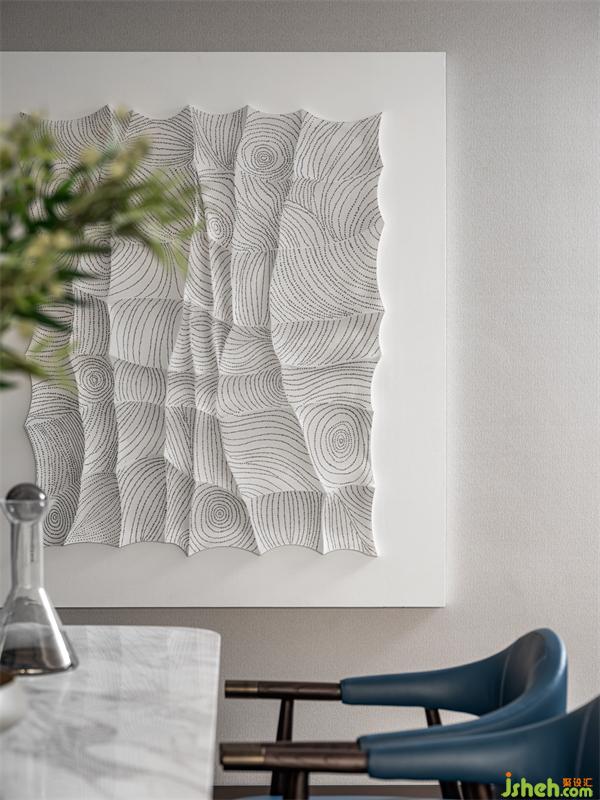 大橫廳的空間設(shè)計,得以上餐廳不再局促,客廳的無主燈設(shè)計,給了餐廳創(chuàng)意吊燈的空間,精致的餐臺,大理石臺面結(jié)合不銹鋼雙圍合式臺腳,搭配精工細(xì)節(jié)的餐椅,所有的種種,都是一種人生的態(tài)度,餐椅近乎靛藍(lán) 的跳色,更是一份與生俱來的優(yōu)雅情懷。