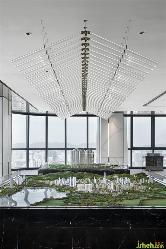 窗外目光所至之美即“區(qū)域”。沙盤之上的動(dòng)態(tài)藝術(shù)吊燈,