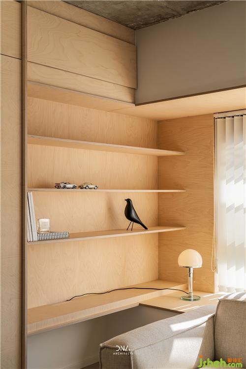 ▼開放書柜以窗臺的延伸形態(tài)呈現(xiàn),更加自然地處理兩個立面的轉(zhuǎn)換關(guān)系。