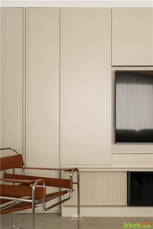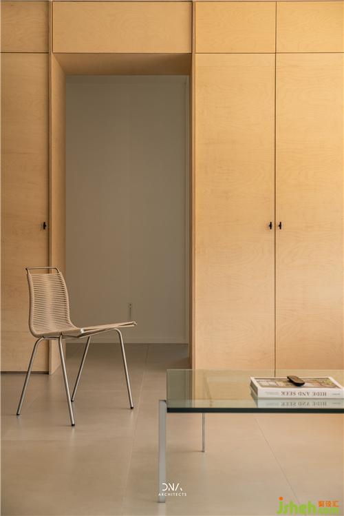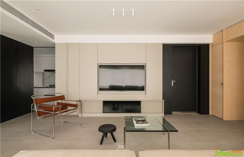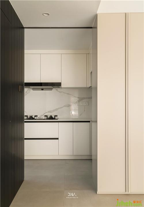 ▼通過黑、灰色兩個塊面之間形成通往廚房的入口,頂面暗裝移門軌道來保持簡潔的設計語言。