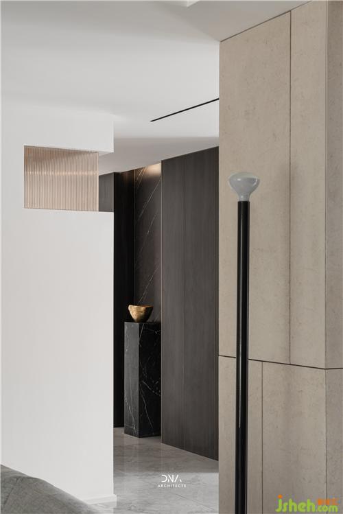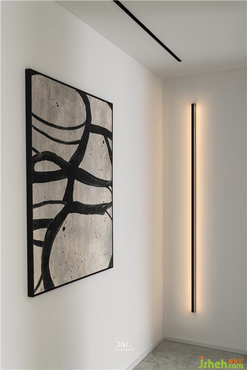 過(guò)道頂部的軌道照明一直延至墻面壁燈,提供照明同時(shí)強(qiáng)調(diào)動(dòng)線引導(dǎo)。