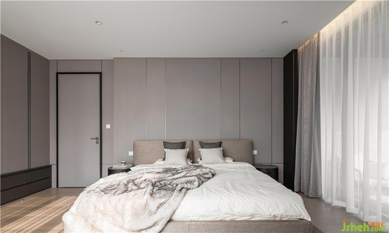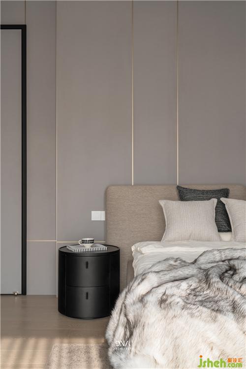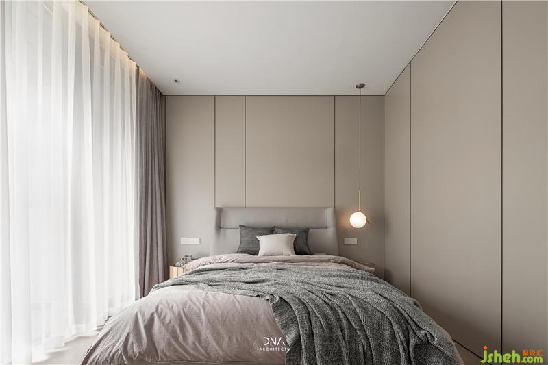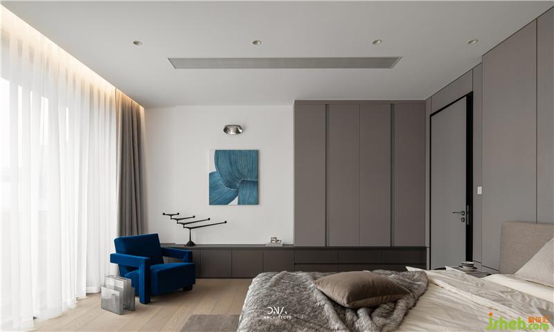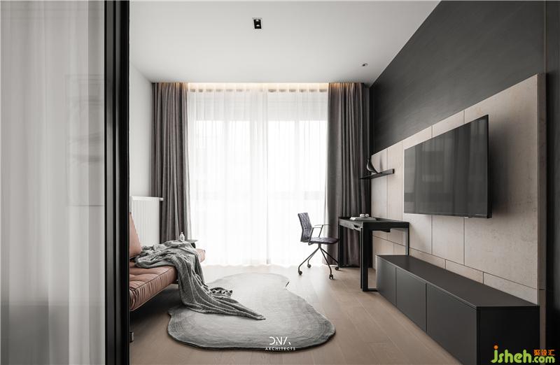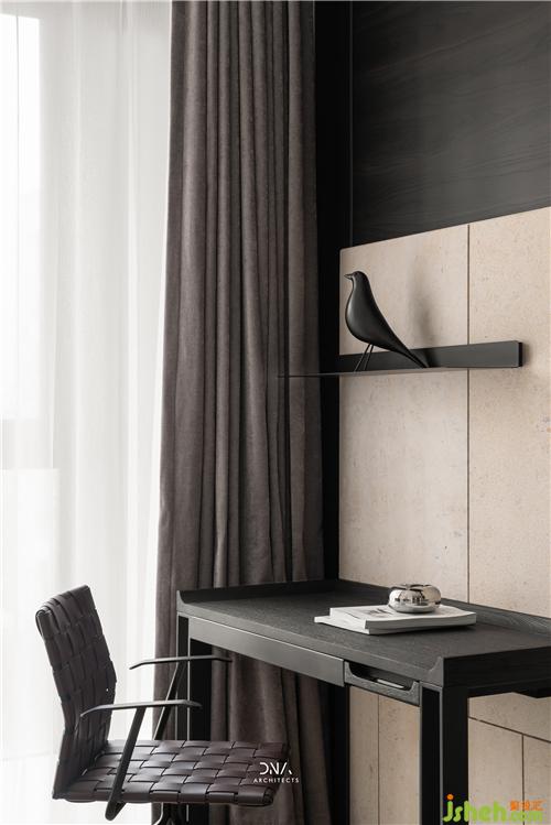The study serves as half public space, integral material is consistent with guest restaurant. But the bedroom chooses downy cloth grain parapet, soft outfit design increase quiet colour mood with blue embellish.