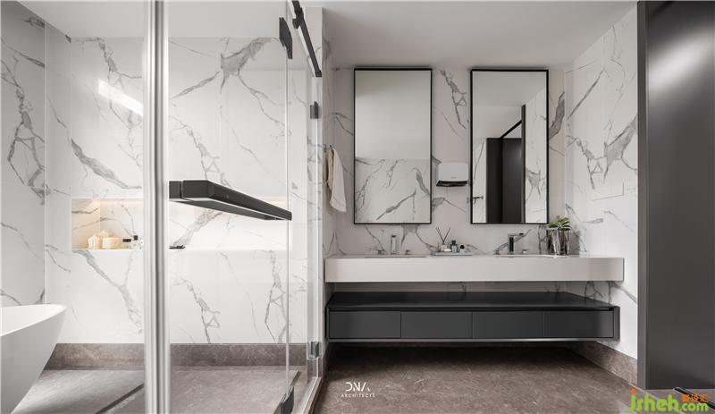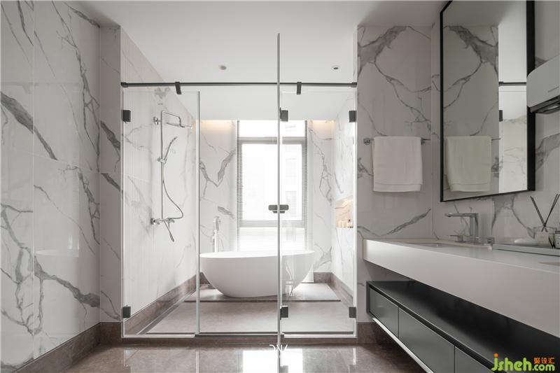 衛(wèi)生間強(qiáng)調(diào)干濕分區(qū),淋浴區(qū)石材經(jīng)過(guò)酸洗處理,增加地面防滑效果杭州裝修設(shè)計(jì),同時(shí)四周設(shè)有排水槽。