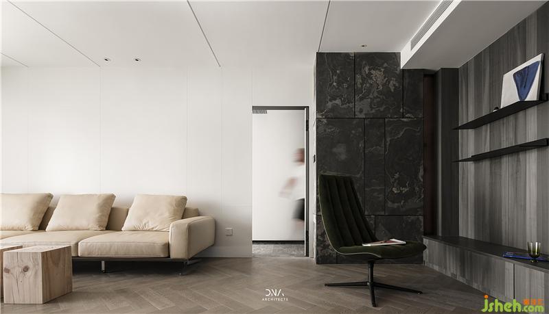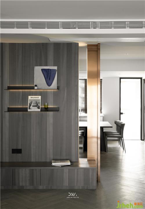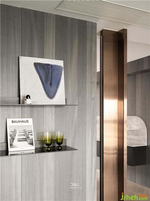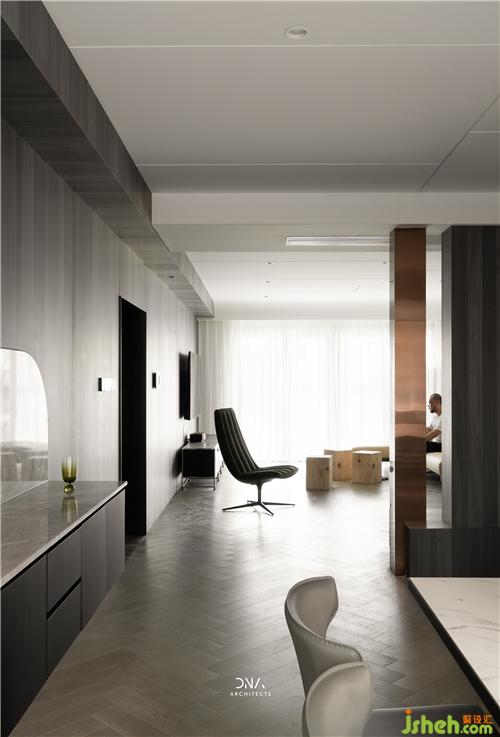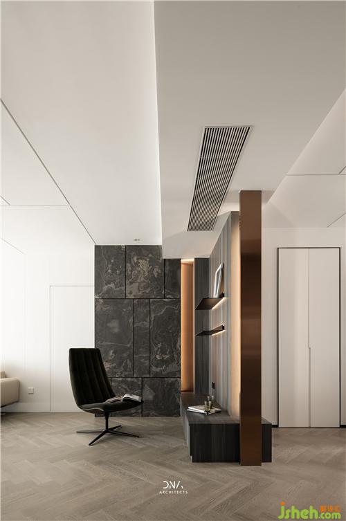 玄關(guān)處,通過(guò)石材清晰的線條,隱約的紋理,籠罩出一種包容之感,暗黑中的優(yōu)雅,愈發(fā)顯得意味悠長(zhǎng)。