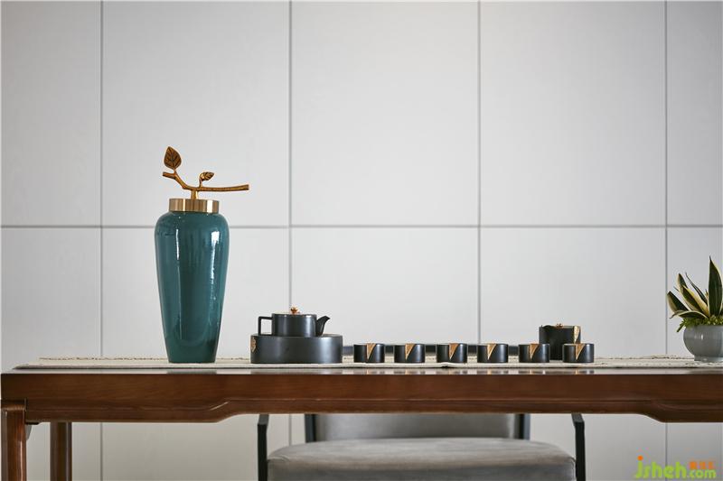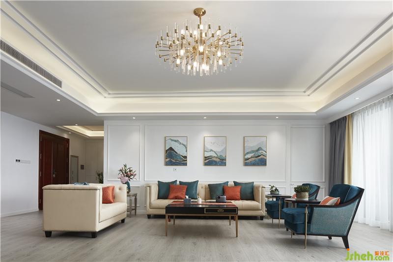 純潔的白色作為空間主體色,搭配簡潔利落的線條,沒有過多的裝飾,采用孔雀藍搭配橙色為客廳增添濃郁的色彩與背景裝飾畫相呼應。室內(nèi)設(shè)計師