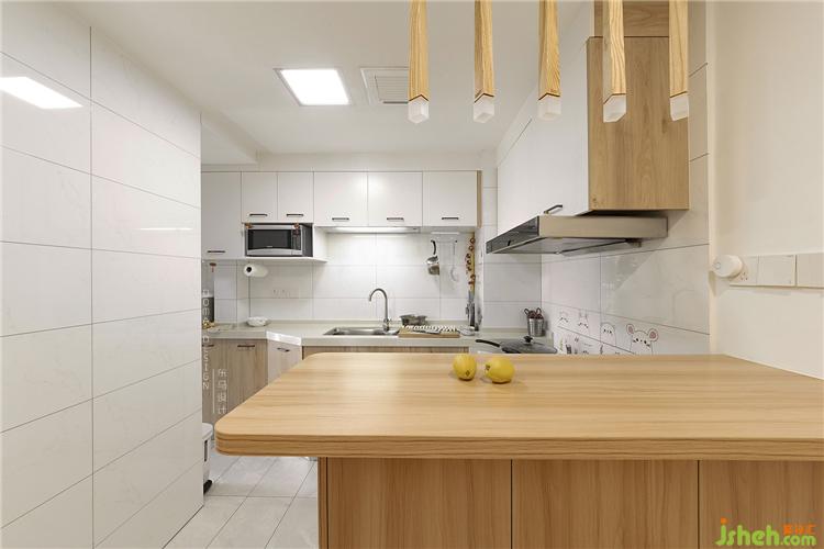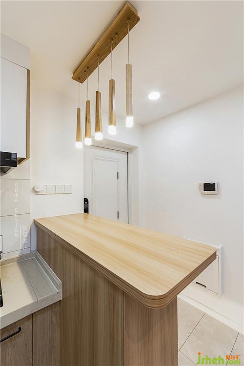 設計師大刀闊斧地將原來的格局推翻重新規(guī)劃,把進門右邊的墻體打掉,擴大進門的視覺感。將原先墻體的位置設計成一個多功能吧臺,設計師巧妙地利用了吧臺下面的柜子變成了鞋柜,與開放式的廚房形成了第一個互動的空間。室內(nèi)設計師