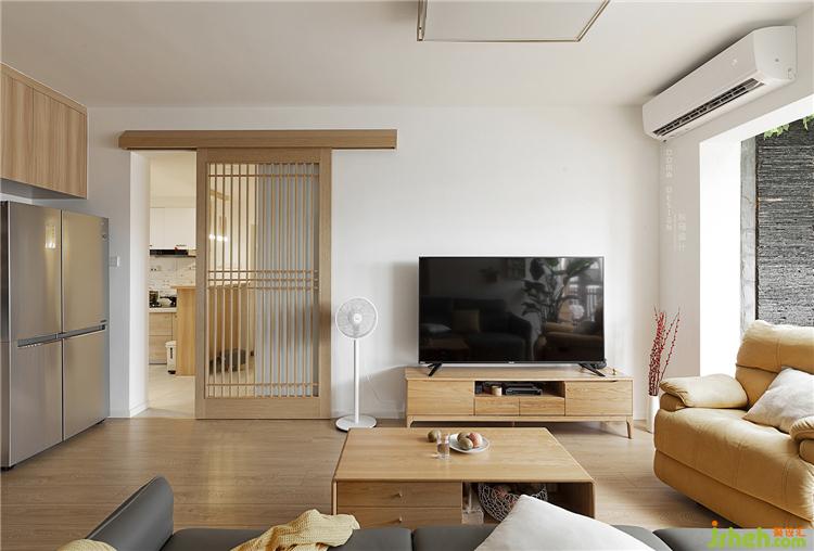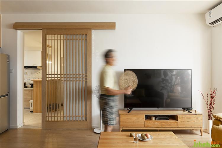 “打開心靈的窗戶,迎接一米陽光”,客廳電視墻的設計就更有意思了,設計師將廚房進客廳的門洞設計成一扇通透的推拉門,它不但是區(qū)分廚房與客廳的一扇門,更是一個襯托出日式風的造型背景,我們叫它“靈性”門。室內(nèi)設計師