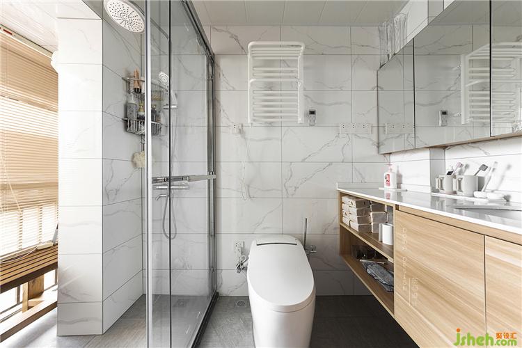 墻面整體用了白色的墻磚,洗手臺(tái)安裝了潔白的玉石,結(jié)合洗手臺(tái)的原木色柜門。地面采用了防滑質(zhì)感的布紋磚,淋浴房除了站立淋浴,也為老人設(shè)計(jì)了坐沐的木長(zhǎng)椅,同時(shí)在面積受限的情況下把陰角位置巧妙地設(shè)計(jì)成桑拿式的沐浴功能,讓老人家更放松方便的享受淋浴。