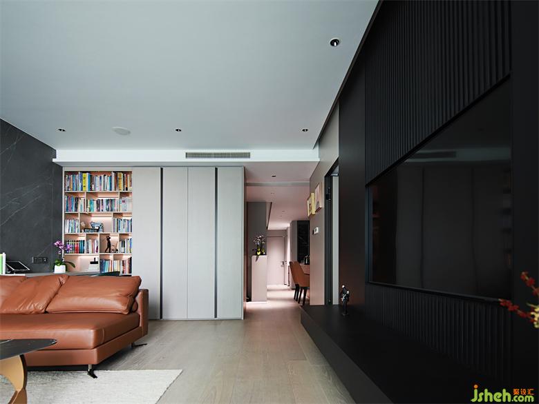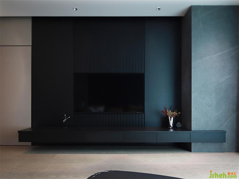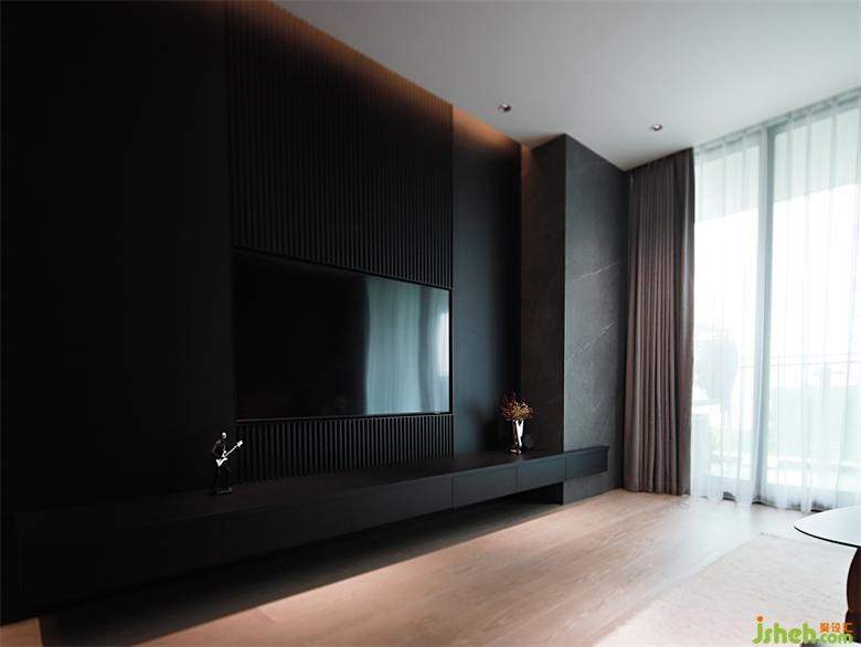 TV wall black paneling and format modeling TV cabinet one color, the overall unity of the dark tonality, the whole space without complex color, complex is simple, with neat lines to describe the level of space, describe the living attitude of the house, hope to feel the mystery of black and white gray, perseverance, strength, senior independence and elegance.