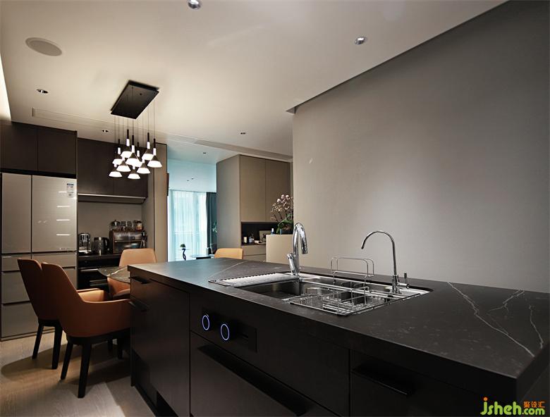 The combination of dark material cabinet and rock plate builds the bearing of wall and ground with unique texture, creating a leisure space with vitality. One kitchen, open kitchen, rock board island, two side cabinets operation, the overall clean and neat, the circular movement route makes the space links more flexible, delicate ornaments on the table, increase the decoration of the space, pleasing to the eye.