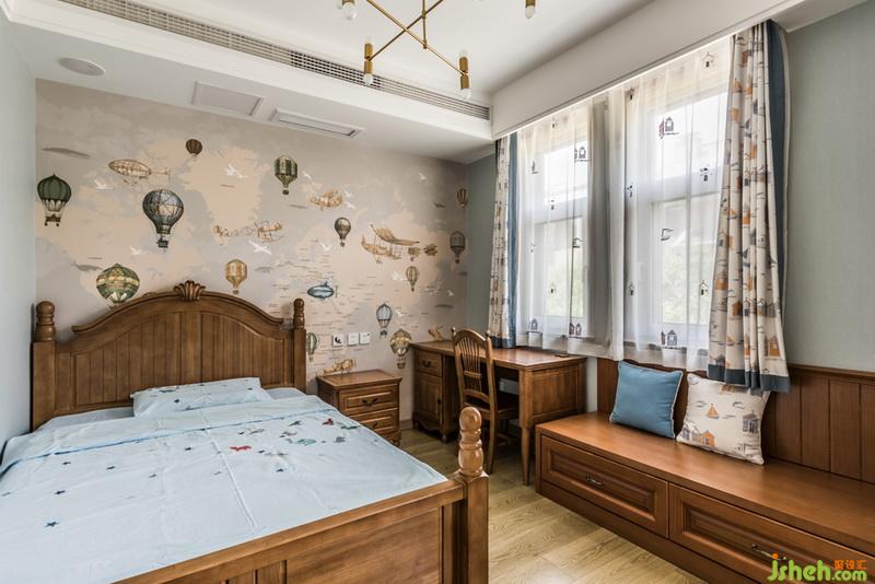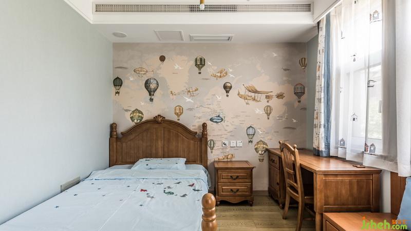 兒童房簡潔明快,室內(nèi)設(shè)計師選擇冷色系和原木家具作為搭配。床頭的背景墻采用了一個熱氣球的壁畫,讓孩子在這個空間充滿童趣和想象的空間。