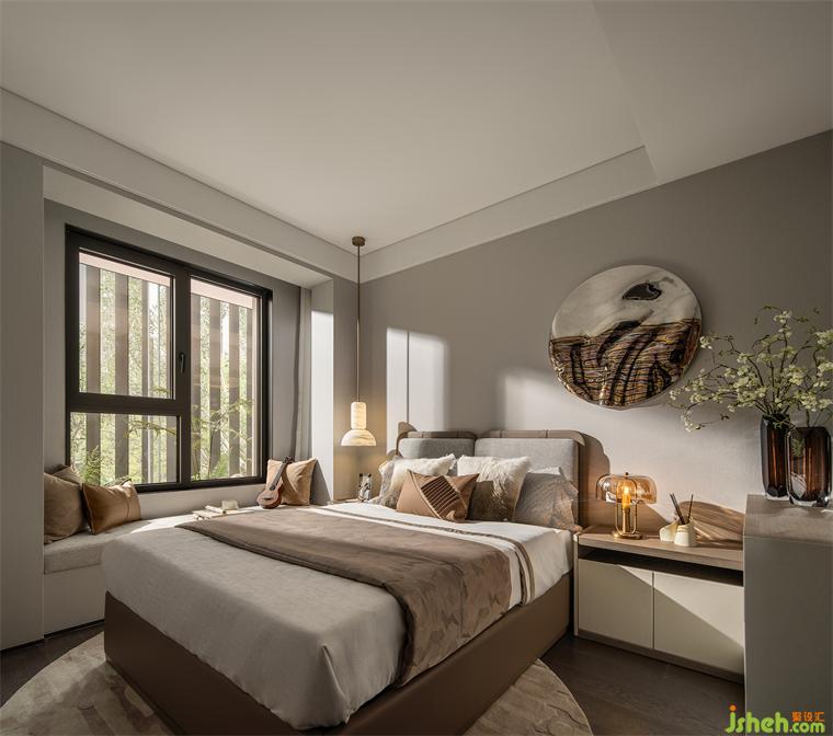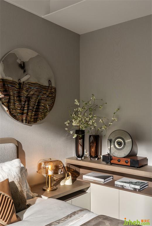 次臥的圓形元素和金屬色的點綴應(yīng)用在房間里,匯合成有趣的光影實驗,這些元素讓家有了活力。樣板間設(shè)計直線與曲線的和諧應(yīng)用,萃取其形而上,與直覺意趣共鳴。