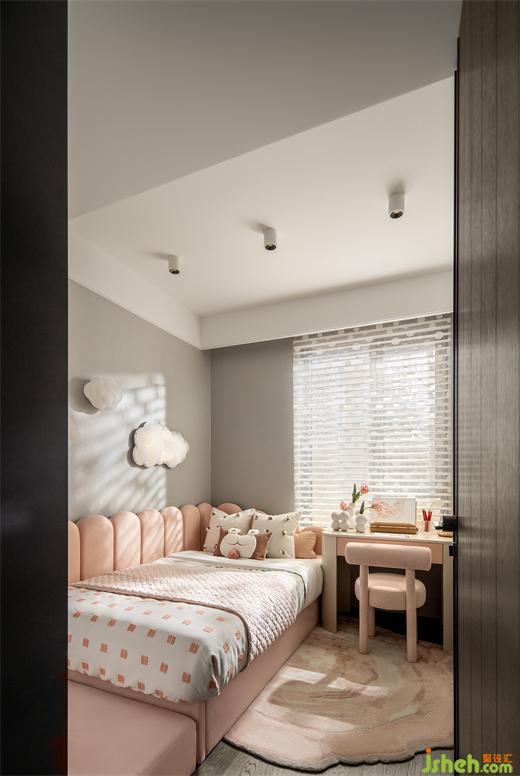 粉色的女兒房溫馨可愛,采用粉色卡通造型家具裝飾,營造出夢幻浪漫的氛圍。搭配可愛的抱枕和云朵掛燈,讓整個房間充滿童趣和溫馨感。